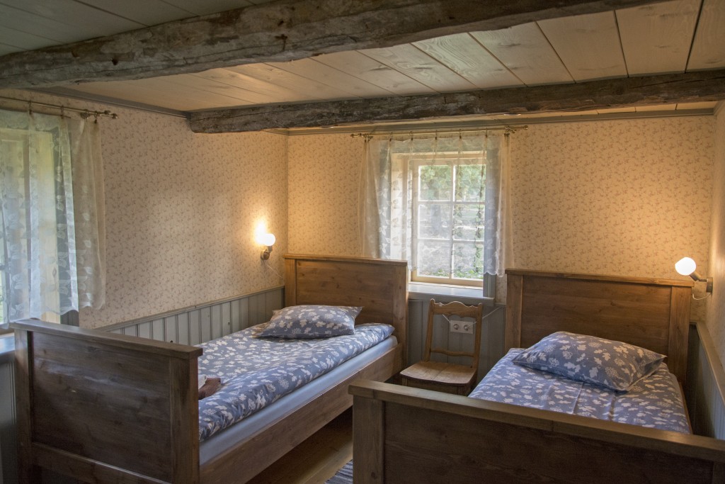 The bigger restored cottage originates from the year 1883 and accommodates 9 people. Two rooms on the ground floor: one with three beds and the other with a double bed. Four-person bedroom on the second floor.